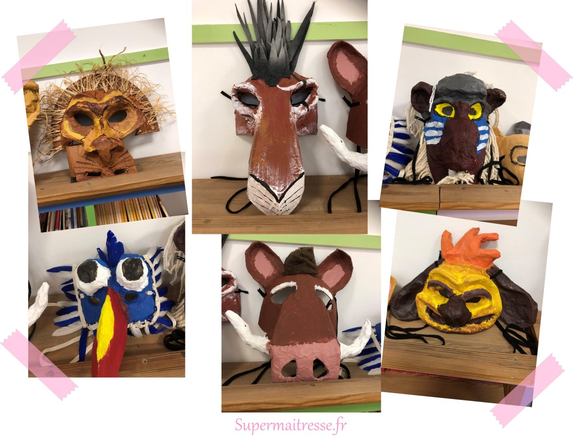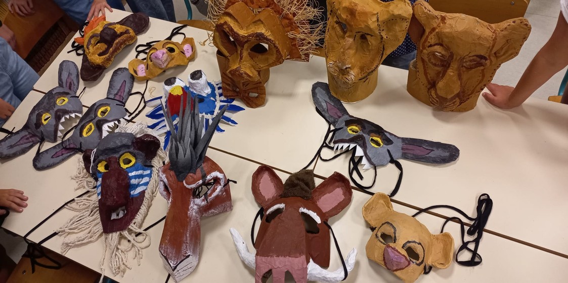 Parallèlement, le projet a intégré un volet en arts plastiques centré sur la création de masques inspirés des personnages du Roi Lion. Accompagnés par notre intervenante en arts, Céline Duvernet, les élèves ont expérimenté différentes techniques afin de concevoir des réalisations à la fois esthétiques et adaptées à la scène. Les masques ont été élaborés en volume à partir de papier mâché, puis mis en couleur. Une attention particulière a été portée à la conception, de manière à laisser le visage des élèves suffisamment visible : jouant sans micro, il était essentiel de ne pas entraver la projection de la voix. Ce travail a ainsi favorisé une meilleure appropriation des rôles tout en stimulant la créativité des élèves.