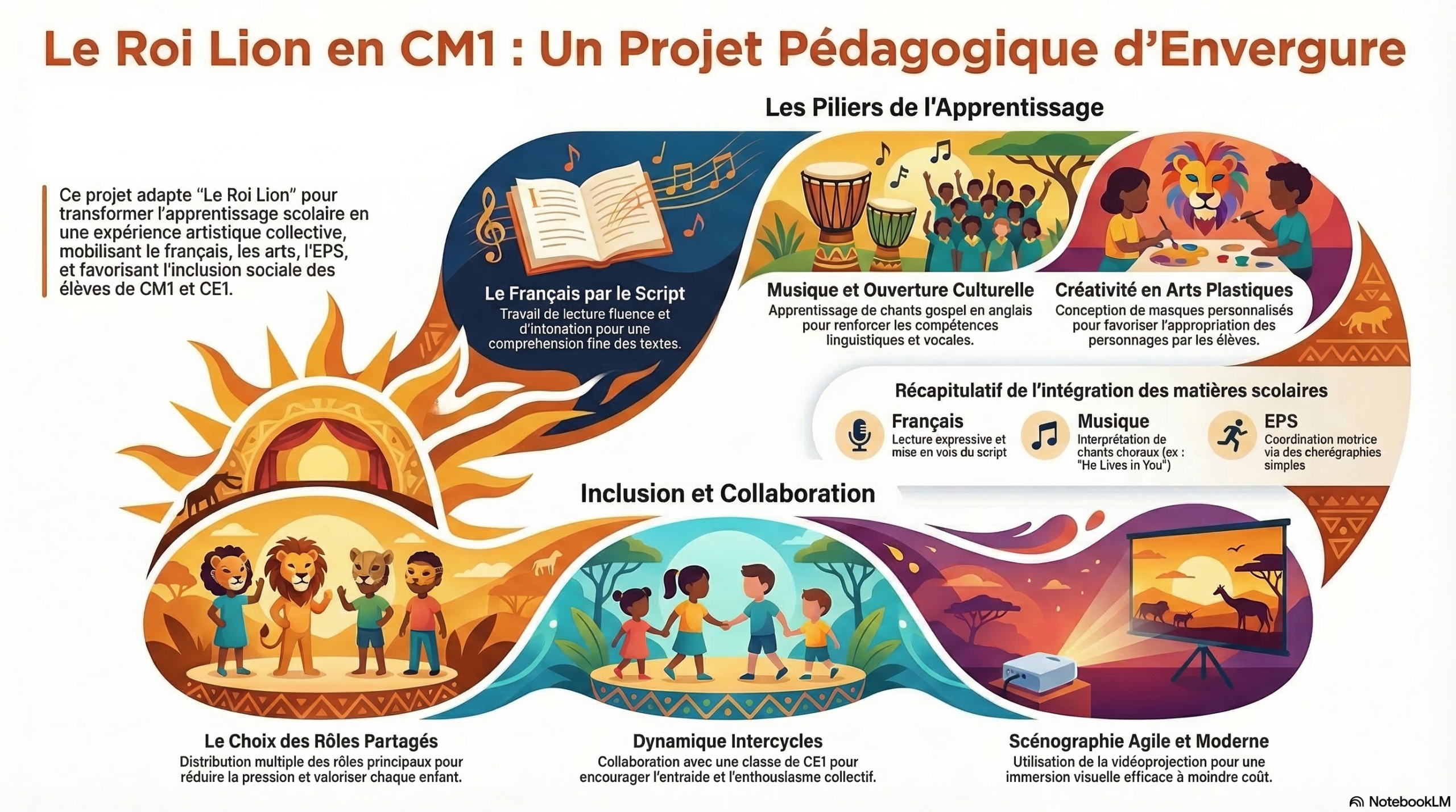 Il y a 3 ans, j’achevais ma carrière d’enseignante en classe en apothéose avec une comédie musicale montée avec mes CM. Je n’étais pas seule, puisque je partageais la classe avec mon binôme et que toute l’année, j’avais mené des projets intercycles avec mon amie Romane et sa classe de CE1. Monter une comédie musicale avec une classe de CM1 constitue un projet pédagogique ambitieux, structurant et profondément fédérateur. À travers l’adaptation du Roi Lion, nous avons mené une démarche pluridisciplinaire mobilisant les compétences en français, en arts, en éducation musicale, en EPS et en travail coopératif, tout en valorisant l’engagement de chaque élève.