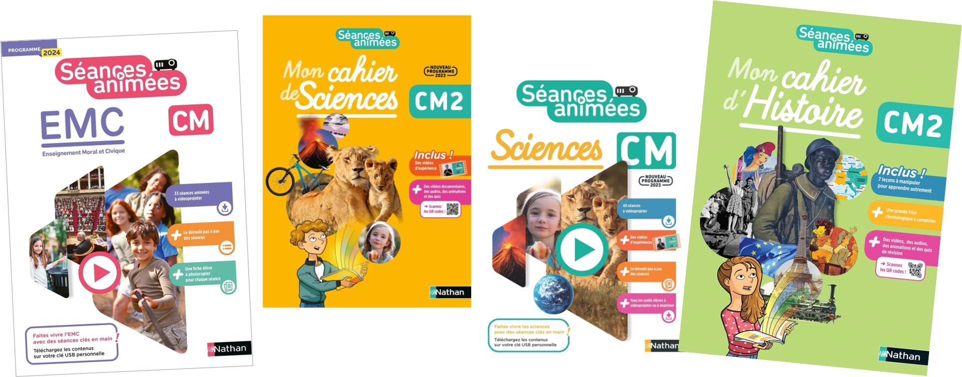 En Histoire, les cahiers Séances animées Histoire CM de chez Nathan sont très bien faits. Le cahier est tout prêt, en couleurs, avec des Qr codes. J’avoue, autant je me régale avec le programme de CM1, autant celui de CM2 ne me plaît pas tellement … Bref, un peu de couleur égaiera mon enseignement ! J’en parle plus en détail ici : CLIC