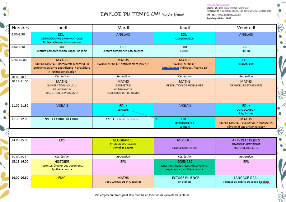 Voici mon emploi du temps CM1 sur lequel je me suis basée :