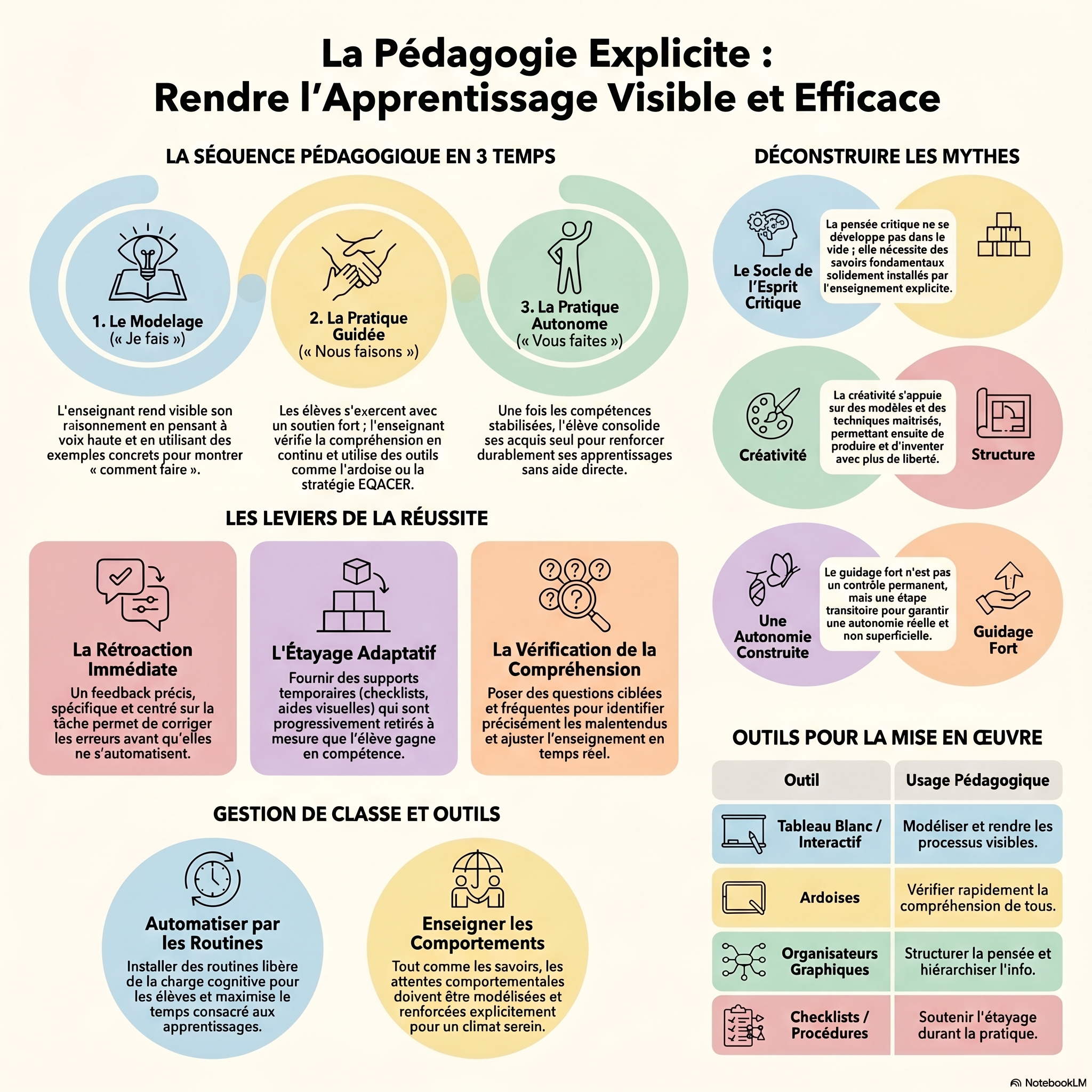 L’enseignement explicite apparaît comme une approche robuste, appuyée par la recherche, qui permet d’optimiser les apprentissages, de développer l’autonomie, la créativité et la pensée critique. Sa force réside dans l’équilibre entre guidage, structuration et ouverture progressive, au service de la réussite de tous les élèves.