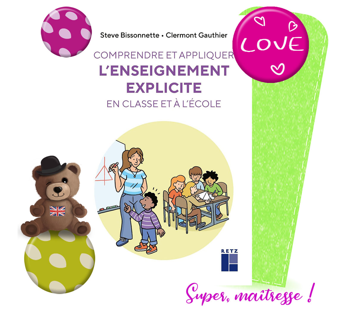 Coup de coeur pour ce livre de Clermont Gauthier et Steve Bissonnette. Comme vous me l’avez demandé, je vous ai préparé une petite synthèse de ce que j’ai retenu (et non un résumé : il faudra le lire), mais moi j’y suis allée chercher ce qui m’intéressait pour mes formations. Franchement, cet article ne vous donne qu’un aperçu du contenu riche de l’ouvrage et je vous invite tout particulièrement à lire en détail les chapitres « Peut-on enseigner les comportements de manière explicite ? » « L’enseignement explicite permet-il le développement des compétences ? » et « L’enseignement explicite empêche-t-il la créativité et le développement de l’esprit critique ? » qui me permettront de répondre aux questions que l’on me pose en formation, lorsque je parle de cette pédagogie qui a tout changé à mon enseignement.